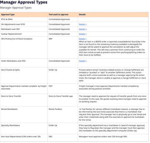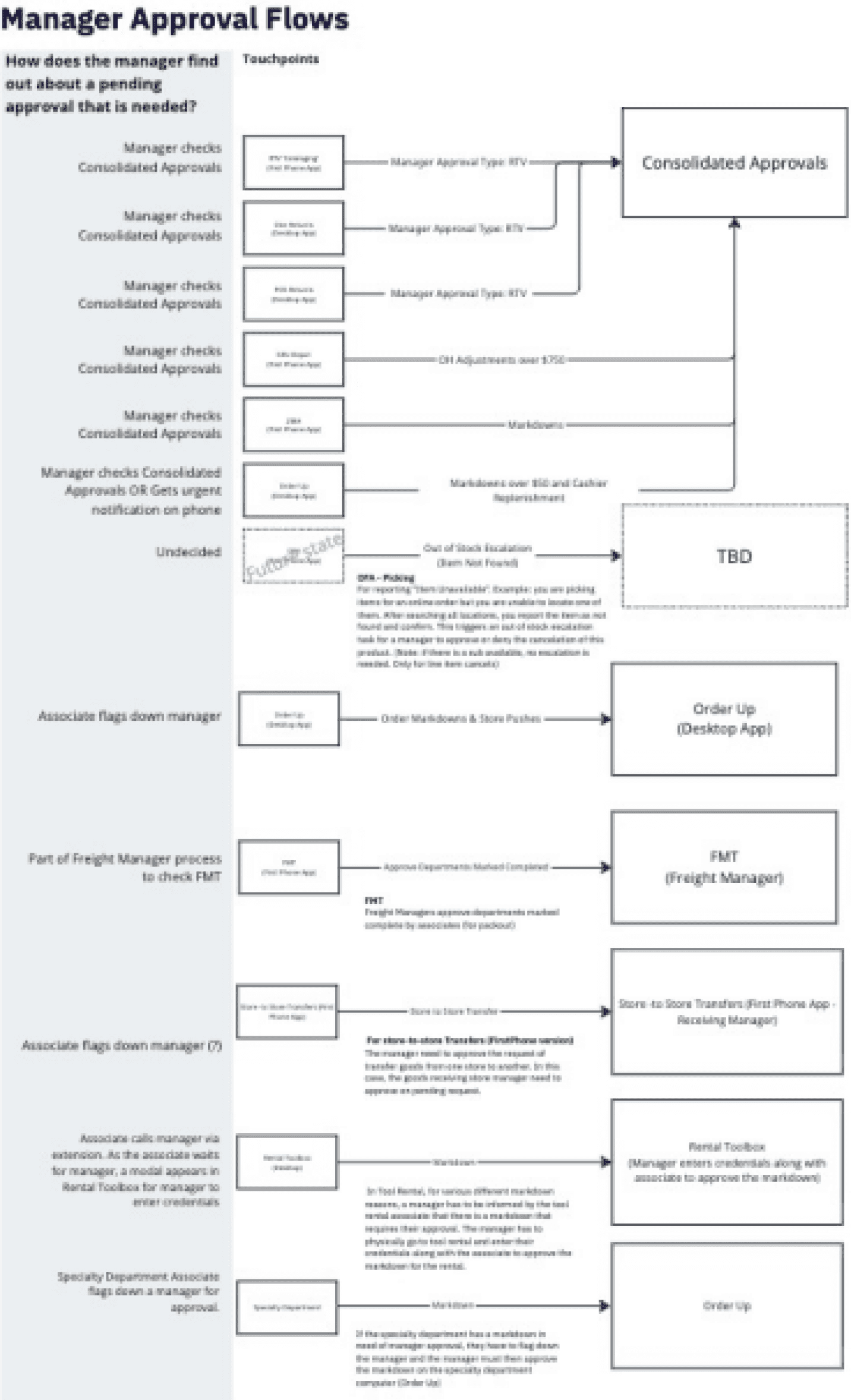 Beyond OH approvals, I mapped all digital manager approval types across store systems to understand how and where managers made approval decisions.
